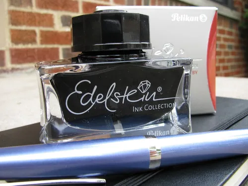 The entries in the Edelstein collection come in a beautiful glass bottle that holds 50ml of ink. The bottle is nice and heavy, with a thick bottom and soft corners. The cap has a raised Pelikan logo gilt in silvery paint. It is definitely intended to be a showpiece – whoever designed it was clearly inspired by jewelry design. It is easily a match for the Iroshizuku ink bottles in terms of beauty, and, depending on your aesthetic preference, may very well surpass it.