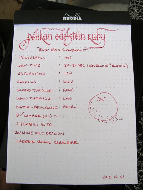 I’ve decided to add a water resistance test to all of my new reviews, and I can safely report that Ruby isn’t water-resistant at all. A drop of water, as one might accidentally deposit from a glass of water, dissolves the ink very quickly. Running the paper under water for thirty seconds washes it almost completely off.