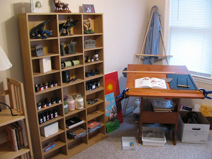 Sure! Here is my shelf of ink and other miscellaneous things, including origami paper and stationary. To the right is my art desk with some sketchbooks, and an origami book open. Behind that is my easel and various painting supplies.