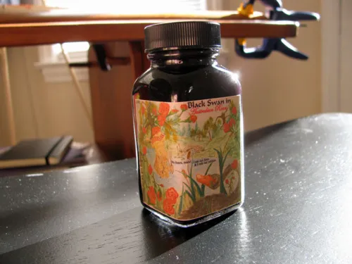However, this bottle’s label contains references to the myth of Leda and the Swan, and interplay between the Noodler’s catfish mascot and a black swan. You can watch Nathan Tardiff, the man behind Noodler’s inks, describe the label in detail here: http://www.youtube.com/watch?v=SUczPSBbxdA.
