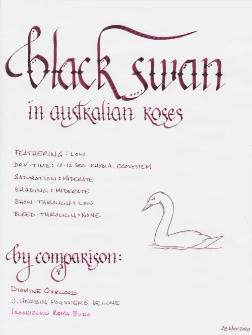 The award for most poetically named ink goes to Noodler’s Black Swan in Australian Roses – one of the most poetic inks I’ve reviewed this year. Black Swan is a brand new ink from Noodler’s that was just released in late November. It is a moderately saturated ink with lots of very moody shading, and was designed to show off the shading potential of flex nibs.