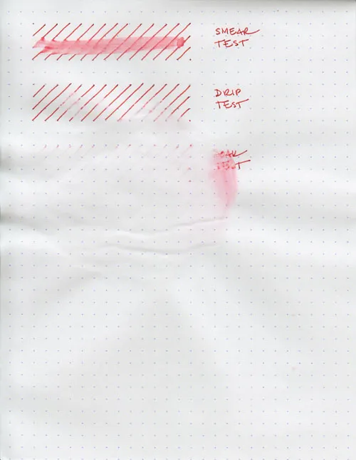 Water resistance is, to my mind, the singular issue with this ink. A smear test, in which I ran a wet finger across the page, did a great job of obliterating the lines and creating a red mess.
