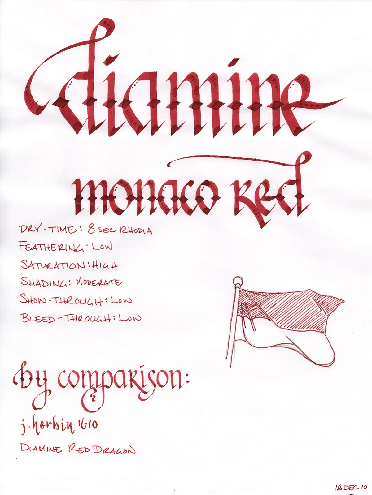 Monaco Red is another great red ink from Diamine. It’s an earthy, orange red with brick undertones – very reminiscent of J Herbin 1670. It is less blue than Diamine Red Dragon and less brown than Diamine Oxblood. According to at least one source, this ink was formulated by Diamine at the special request of the Crown Prince of Monaco. I presume the ink was engineered to match the red in the Monegasque flag and coat of arms.