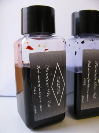 Diamine inks are available in a 30ml plastic bottle and an 80ml glass bottle, both of which are utilitarian in appearance. The smaller plastic bottle has a neck that is very small in diameter. I found that some of my larger pens, like a Lamy 2000, would not fit all the way in, which made getting to the ink a bit of a challenge. My recommendation would be to go for the larger bottle.