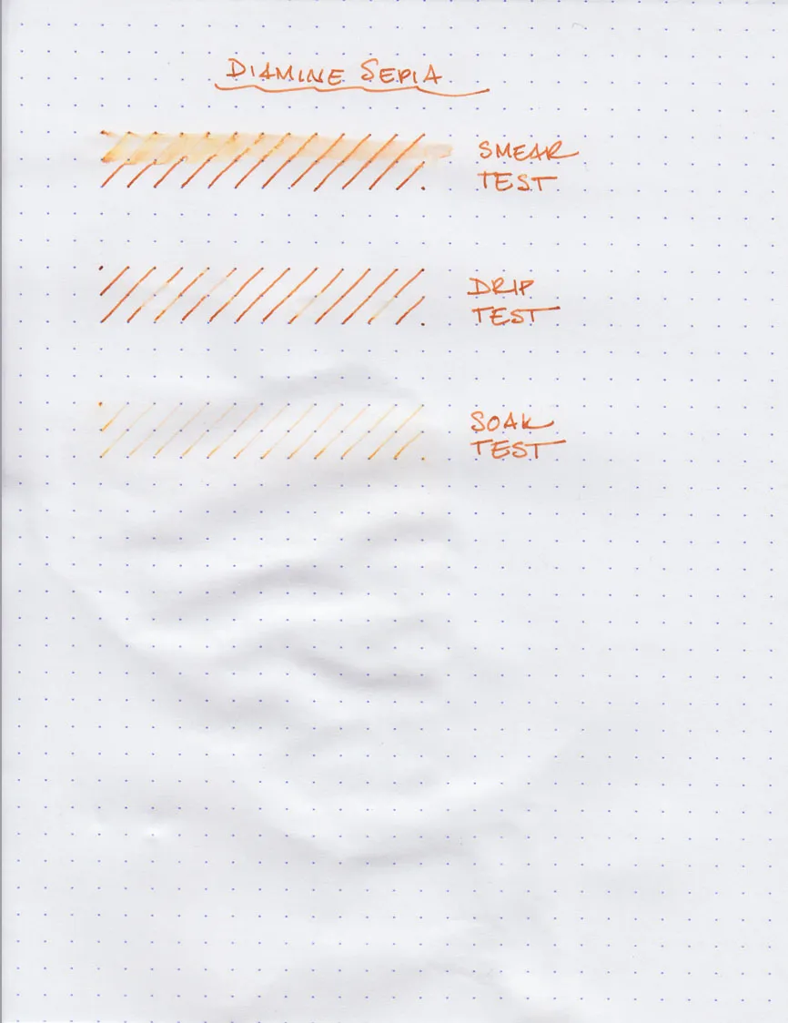 Where Sepia falters, for those who are concerned about such things, is in its resistance to water. For the smear test, I dragged a wet finger across the page, which did a good job of leaving a golden smear and obliterating most of the lines. For the drip test, I let droplets of water stand for about a minute before blotting them up. The water did an effective job of pulling the ink from the paper.
