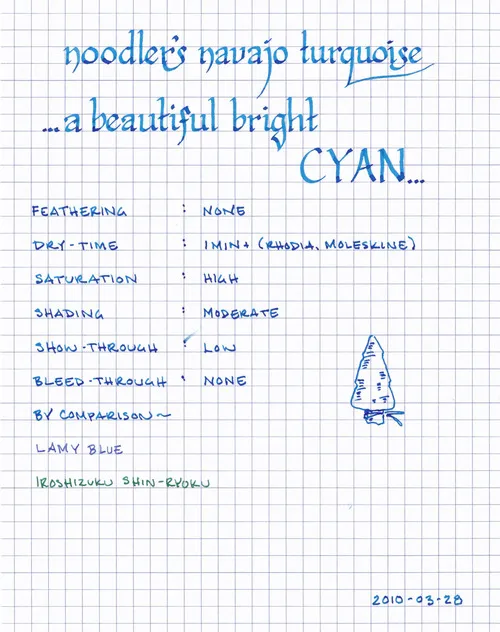 Noodler’s inks tend to flow well – unlike J. Herbin inks, which have a watery character, Noodler’s inks feel slightly viscous and provide a slight lubricating quality. Each pen I’ve used them in tends to glide smoothly across the paper. Another characteristic of Noodler’s inks is their resistance to feathering – on both Rhodia and Moleskine journals, Navajo Turquoise does not feather at all. Compared to Noodler’s Black, Navajo Turquoise exhibits a slightly higher level of show-through, but it is still very low. Even in my wet-writing Lamy Studio, I’ve noticed almost no bleed-through on any paper – including the thin paper of a Moleskine cahier.