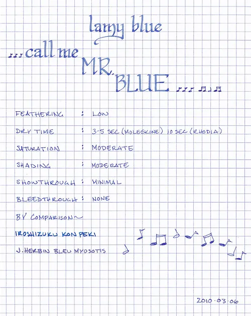 Unlike J. Herbin inks, which tend to be quite wet, Lamy Blue is a fairly dry. Perhaps because of this, feathering is almost nonexistent on Moleskine or Rhodia papers. Similarly, bleed-through isn’t an issue and show-through is minimal at worst.