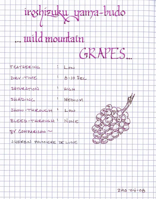 Iroshizuku Yama-budo (wild mountain grapes) is a vibrant purple ink the color of fresh grape juice that’s been spilled across a glazed, porcelain countertop. It is brighter and juicier than J. Herbin Poussiere de Lune, which, itself, can be favorably compared to a red wine stain.