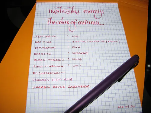 A note about the scan (or lack thereof): I normally scan in the written portion of my review and then make very minor adjustments to the brightness to bring the scanned image back into line with the physical version. However, Momiji appears to be impossible to accurately represent with a scan. When scanned in on both scanners I have available to me, the ink turns a bright pink. Thus, I had to resort to a picture taken in natural light.