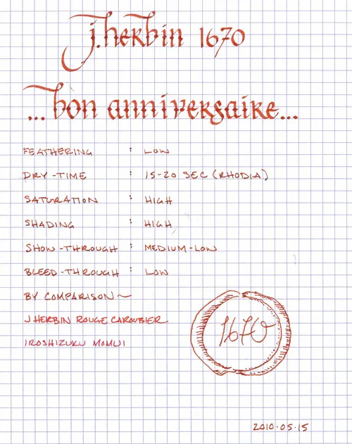 Overall, J. Herbin 1670 is an amazing ink – one that makes me excited to see what they will produce next. Though I’ve only had the bottle for a few days, it has already surpassed Iroshizuku Momiji as my favorite red ink. The color is dark and rich enough to be easily readable on both white and off white paper, and I see myself using it for much of my daily writing. Of any red ink that I’ve used, it is the best candidate for being business appropriate – there is a certain gravitas to 1670 that its cousins lack.
