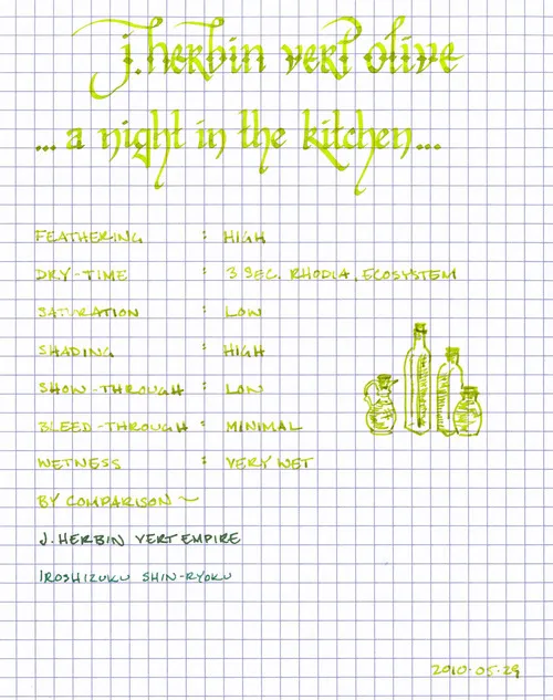 While Vert Olive is a beautiful ink, due to its brilliant color I can only see using it for editing, highlighting, calligraphy, or other artistic endeavors.