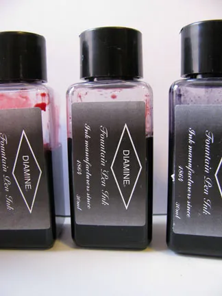 Diamine inks are available in a 30ml plastic bottle and an 80ml glass bottle, both of which are utilitarian in appearance. The smaller plastic bottle has a neck that is very small in diameter. I found that some of my larger pens, like a Lamy 2000, would not fit all the way in, which made getting to the ink a bit of a challenge. My recommendation would be to go for the larger bottle.