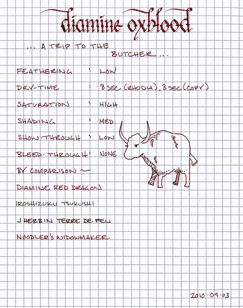 As with the other Diamine inks that I’ve tried, Oxblood flows easily, and provides a nice level of lubrication, allowing the pen to glide easily across the page. It is not as thin as J. Herbin inks, nor as thick as Noodler’s inks; it sits nicely in the middle. I noticed very little feathering on any of the papers I tested this with. It is a very strong color, but doesn’t exhibit much show-through. It also behaves well with regard to bleed though – I noticed no bleed through with an EF nib on Rhodia, Moleskine, and garden variety copier paper.