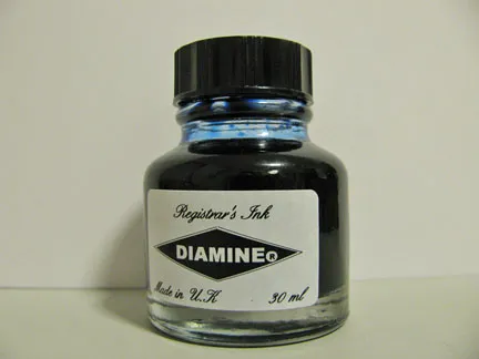 Diamine Registrar’s Ink is sold in 30ml glass bottles and 100ml plastic refills. The glass bottle is functional and not much more. It has a simple label with the Diamine diamond logo on the front and a nice, secure lid. It’s the kind of bottle that one shoves in the drawer when one is finished with it.