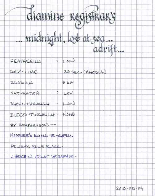 I’m happy that I decided to investigate blue-black inks. Diamine Registrar’s ink has a magical character, and has a wide range of applications. As a permanent ink, it’s definitely business appropriate, and would make a good signature ink. It’s also interesting and well-behaved enough to use for daily writing and journaling. The only drawback is that it is more expensive than many standard inks – but for those who value permanence in their fountain pen ink, it’s a premium worth paying for.