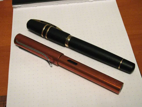At 5.75 inches, the Visconti is just a bit longer than a Lamy Safari (or an Al-Star, pictured here). However, it is quite a bit heavier, weighing in at 1.6 ounces - a full ounce heavier than the Safari. Those that prefer their pens light may want to test drive one before purchasing. The cap is heavy enough that it does not lend itself to posting, but at 5.625 inches long unposted, I can hold it comfortably in my gorilla-sized hands.
