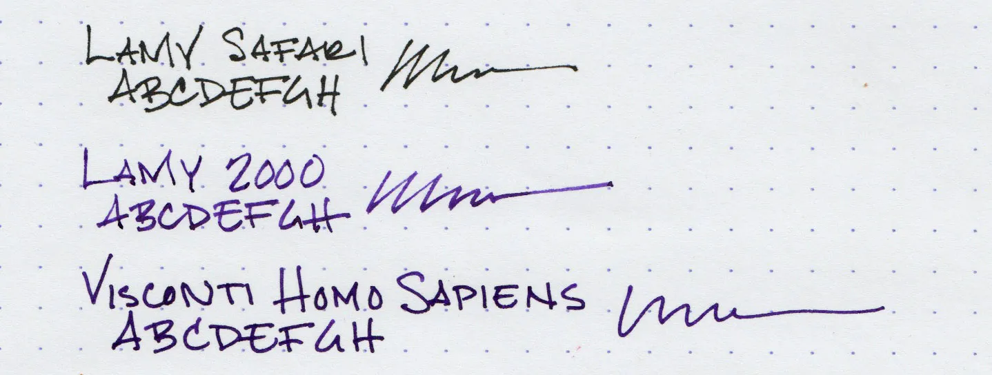 On Rhodia paper, the EF nib produces a line very similar to the gold EF nib on my Lamy 2000. However, the extra ink it puts down results in a much darker line; both writing samples above were written with Diamine Imperial Purple, and the Visconti is clearly darker. On more absorbent papers, like that in a Moleskine cahier, the line ends up being somewhat thicker - acting more like a fine nib.