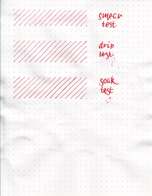 The smear test, in which I run a wet finger over the paper, revels that the ink can be smudged with a bit of effort. If you look close, you can see a fine pink tint to the paper where I dragged it across the lines. On the other hand, the drip test, in which I let droplets of water settle on the page before blotting them up, and the soak test, in which I run the paper under the faucet for a minute, show that the ink hasn’t moved at all. I was incredibly surprised! It doesn’t look like I got water near it at all – a major difference from most dye-based inks.