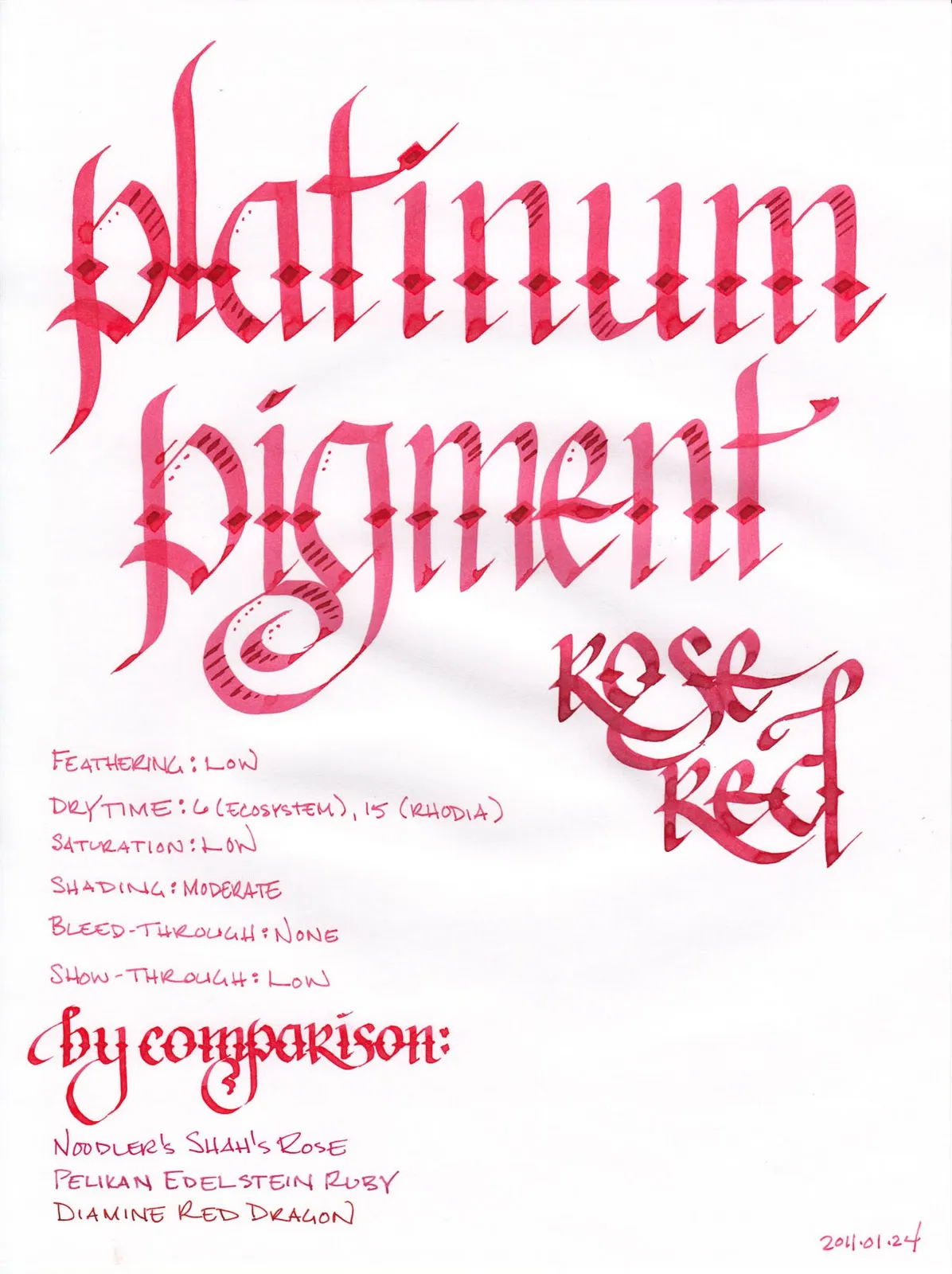 For my first experience with pigment-based inks, Platinum Pigment Rose Red left me satisfied. The color is far too pink and light for my everyday use, but it leaves me excited to try the other colors in the Platinum Pigment line. For those that like rose colored inks, this is definitely one to consider.