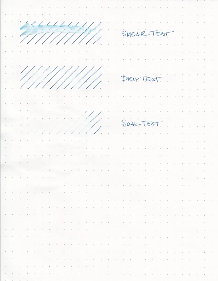 For an ink labeled as permanent, though, it is anything but waterproof. The smear test, in which I drag a wet finger across the page, produced a lovely teal smudge which obliterated any trace of the underlying line. The drip test, in which I let a drop of water sit on the paper for a minute before blotting, lifted a significant amount of ink from the page.