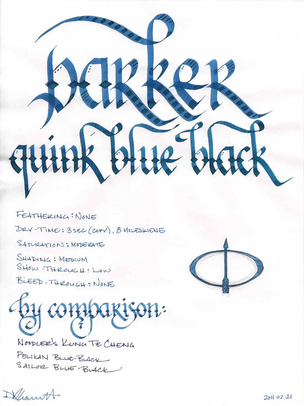 Parker Quink Blue Black is a solid ink that is a tremendous value for the price. If you’re looking for an inexpensive, well-behaved, daily use ink, then this is an excellent candidate. If you’re looking for something flashy or bold, then look elsewhere.