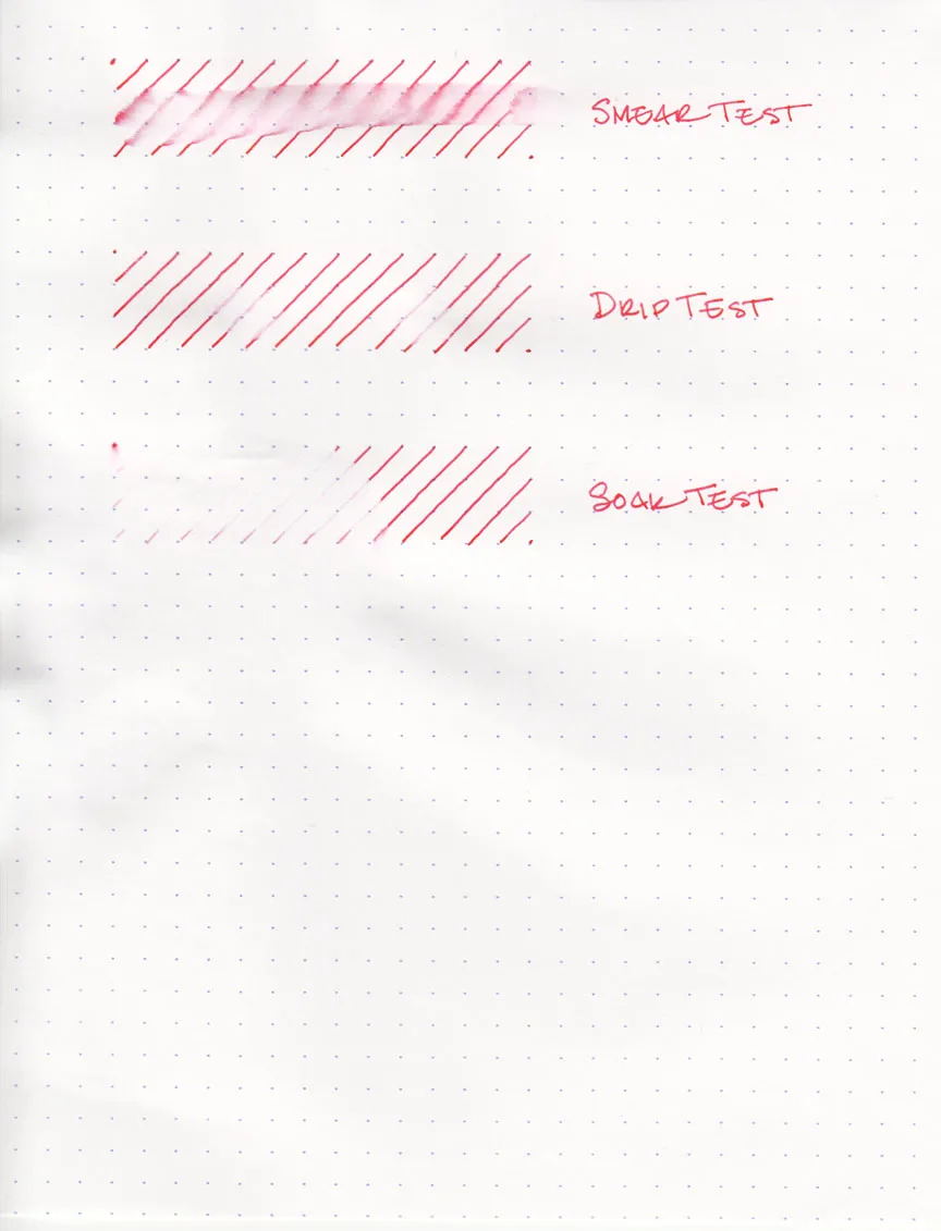 The drip test, in which I let several droplets of water soak on the page before blotting, resulted in the ink being lifted almost entirely from the page; only a hint of the original lines remained. Similarly, the soak test, in which I run the paper under a stream of water, washed the ink away quite effectively. It’s an attention-getting ink, to be sure, but not one which you’d want to use in any water-sensitive situations.