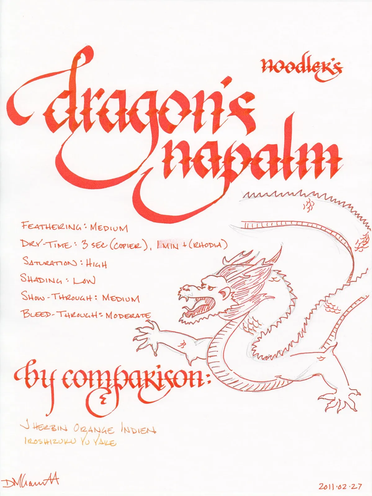 With a few exceptions, Noodler’s inks also tend to behave in a specific fashion with the fountain-pen friendly Rhodia paper, and Dragon’s Napalm remains consistent. I found no feathering, no bleed-through, and a low level of show-through. On the other hand, the drying time was over 1 minute. It’s a shame that so many of the Noodler’s inks I’ve tried take so long to dry on Rhodia paper, since they otherwise behave so well.